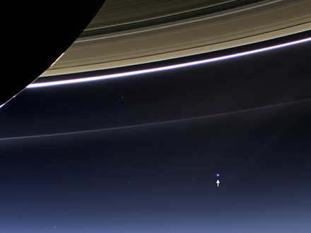 See that black thing up in the corner? That’s Saturn, with its rings evident toward the top of the frame. And that tiny dot with the arrow pointing to it? That’s Earth, as viewed from the Cassini space probe now heading out of our solar system.
